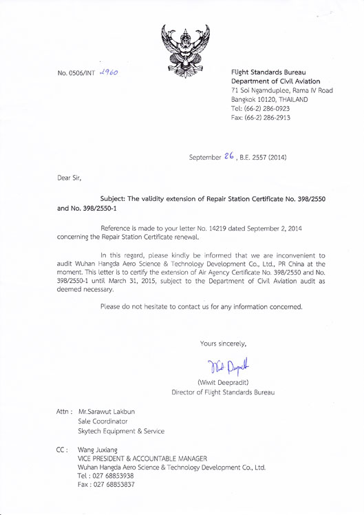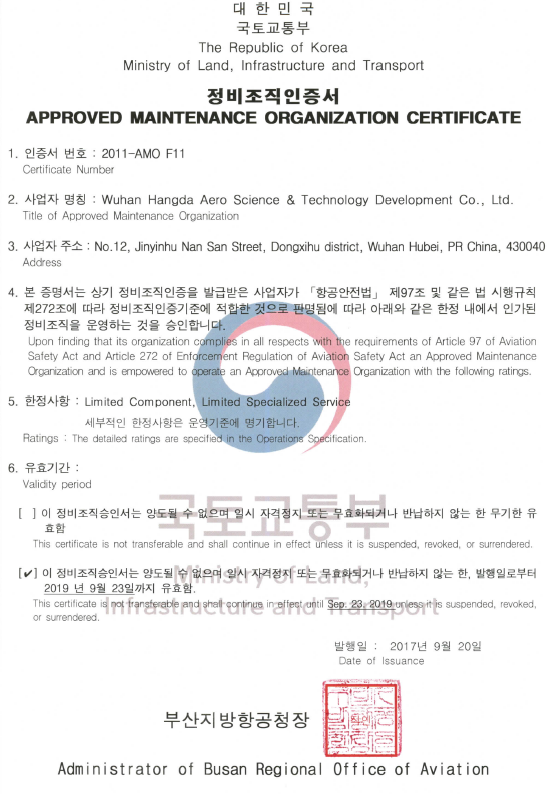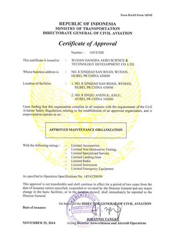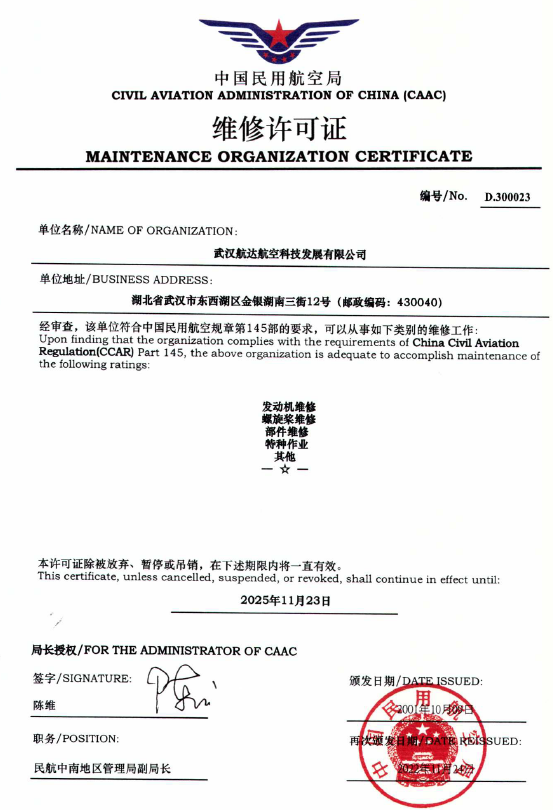 2001年10月 公司獲中國民航總局授權(quán)的民航維修許可證。